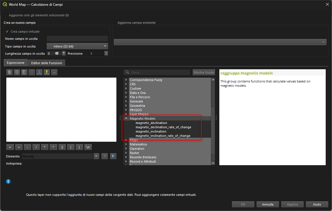 Queste espressioni aiutano a calcolare la declinazione e l'inclinazione magnetica, e le rispettive variazioni annue. Sono ideali per layout cartografici o metadati che richiedono informazioni magnetiche aggiornate. é stato aggiunto un nuovo gruppo nel Field Calc.