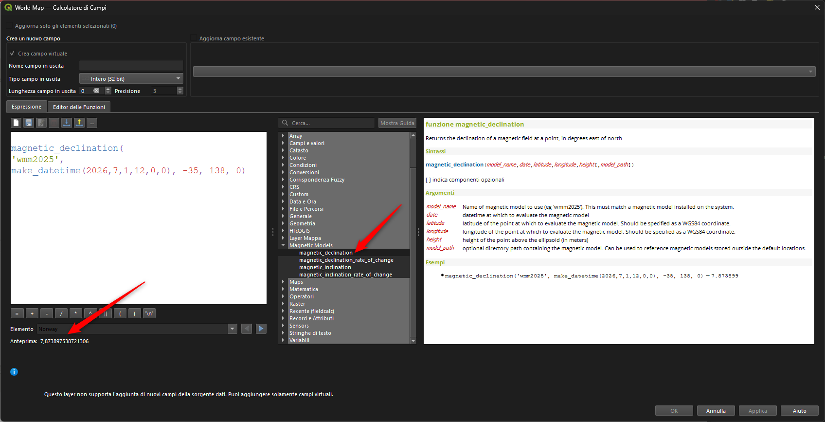 NB: I modelli non sono inclusi nel pacchetto QGIS: è necessario scaricarli manualmente (e quindi utilizzare il percorso completo del modello nella funzione di espressione o installarlo in C:/ProgramData/GeographicLib/magnetic).