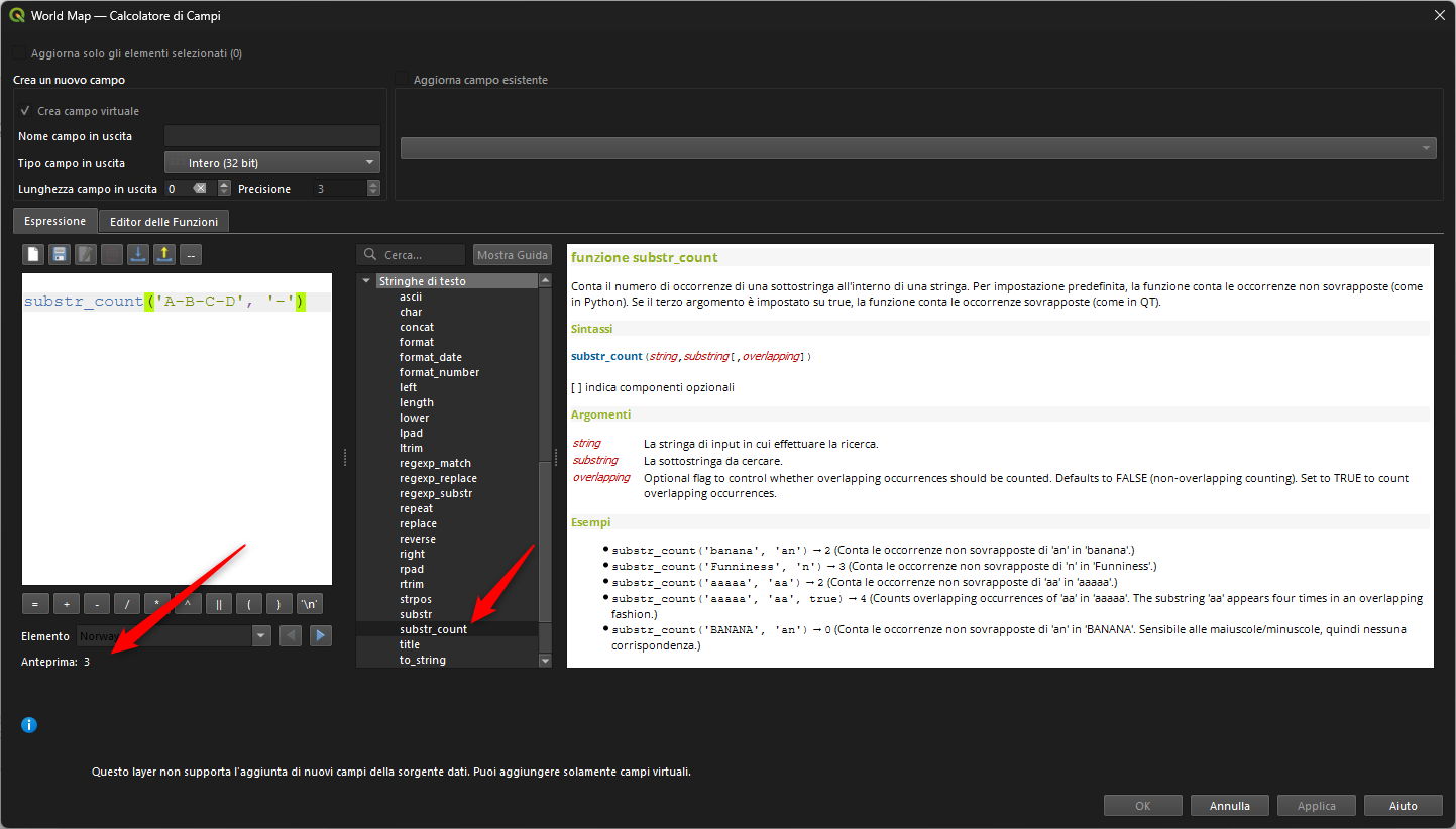 Conta il numero di occorrenze di una sottostringa all'interno di una stringa. Per impostazione predefinita, la funzione conta le occorrenze non sovrapposte (come in Python). Se il terzo argomento è impostato su true, la funzione conta le occorrenze sovrapposte (come in Qt).
