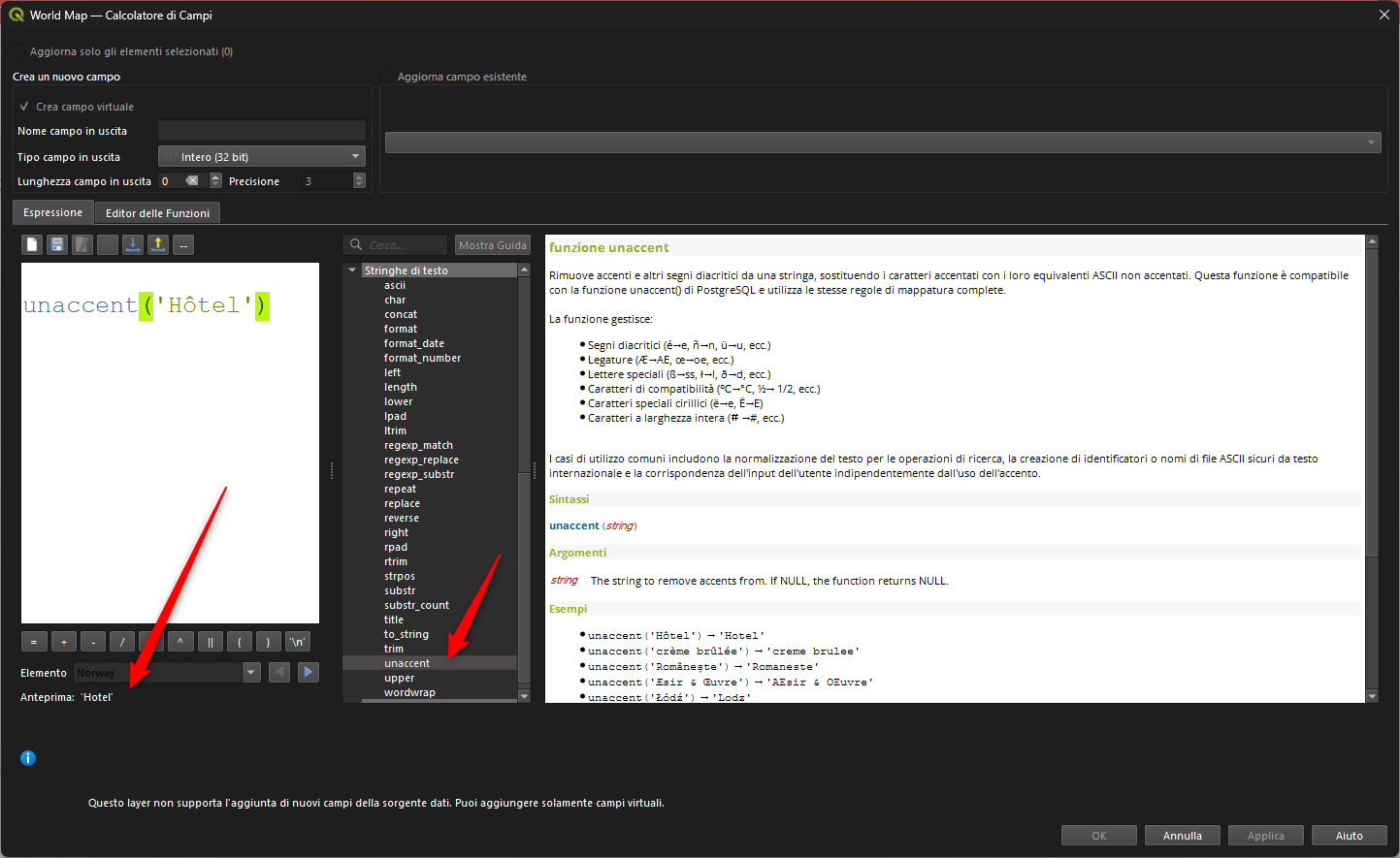Rimuove accenti e altri segni diacritici da una stringa, sostituendo i caratteri accentati con i loro equivalenti ASCII non accentati. Questa funzione è compatibile con la funzione unaccent() di PostgreSQL e utilizza le stesse regole di mappatura complete.
